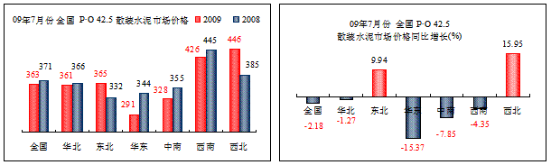 受兩方面因素影響,09年全國水泥價格總體略低于去年水平。一是內(nèi)部因素,去年水泥產(chǎn)能增長過快,超過了需求上升的速度,造成了有市無價。二是外部因素,煤炭價格同比處于相對低位為水泥價格的下移提供了一定空間。但不同地區(qū)的差別較大,西北和東北地區(qū)價格上揚,西北地區(qū)價格比去年增長了60元/噸,增幅達15.95%,華東和中南地區(qū)價格下降,華東地區(qū)價格比去年下降了15.37%。
