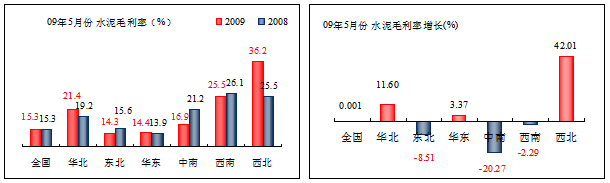 09年1~5月全國水泥毛利率和去年持平,西北、西南和華北地區(qū)毛利率均超過20%,西北高達36%。但中南地區(qū)下跌,降幅較大;華東地區(qū)表現(xiàn)要好于去年同期。