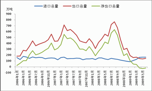 受世界經(jīng)濟(jì)衰退、需求大幅萎縮的影響,進(jìn)入2009年國(guó)內(nèi)鋼材出口面臨嚴(yán)峻的困境與挑戰(zhàn)。在已經(jīng)過(guò)去的2009年上半年,國(guó)內(nèi)鋼材貿(mào)易進(jìn)出口總量大幅縮減、出口持續(xù)低迷成為市場(chǎng)最主要的特征,體現(xiàn)為國(guó)內(nèi)鋼材出口總量同比大幅減少,相對(duì)而言,由于需求、國(guó)內(nèi)外價(jià)差等因素的影響,進(jìn)口總量小幅上升。