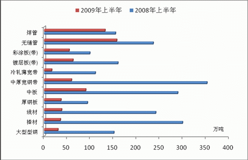 2009年上半年國(guó)內(nèi)鋼材出口市場(chǎng)經(jīng)歷了2006年以來(lái)最為嚴(yán)峻的惡劣形勢(shì),國(guó)內(nèi)市場(chǎng)主要鋼材出口品種、主要出口目的地鋼材出口量和出口金額均大幅縮減,國(guó)內(nèi)市場(chǎng)再次出現(xiàn)凈進(jìn)口局面。
