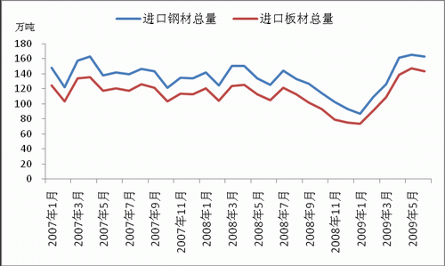 2009年上半年國(guó)內(nèi)進(jìn)口鋼材812.2萬(wàn)噸,同比下降僅1.6%。在主要進(jìn)口品種中,板材累計(jì)進(jìn)口704.4萬(wàn)噸,同比增長(zhǎng)2%,成為國(guó)內(nèi)鋼材從凈出口轉(zhuǎn)向凈進(jìn)口狀態(tài)的主要變化因子之一;棒線材累計(jì)進(jìn)口32.3萬(wàn)噸,同比下降37.3%;管材累計(jì)進(jìn)口36.7萬(wàn)噸,同比下降27.6%。