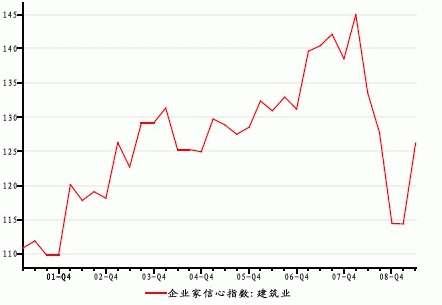 根據(jù)國家統(tǒng)計(jì)局?jǐn)?shù)據(jù):2009年1-6月,我國城鎮(zhèn)固定資產(chǎn)投資53520億元,同比增長33.6%;增速比1-5月加快0.7個(gè)百分點(diǎn)。其中6月固定資產(chǎn)投資增速達(dá)35.25%,僅次于上月38.7%的增速。房地產(chǎn)開發(fā)投資增速也自09年2月觸底后逐步回升,顯示一定的復(fù)蘇態(tài)勢,但仍低于上年同期 23.6個(gè)百分點(diǎn)(具體見圖3)。建筑業(yè)的企業(yè)家信心指數(shù)也在2009年第一季度觸底后回升(具體見圖4)。房地產(chǎn)行業(yè)的復(fù)蘇及建筑業(yè)信心的恢復(fù)均使建材產(chǎn)品的需求有望保持較好的增長態(tài)勢。