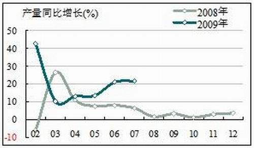 2009年1~7月發(fā)布的運(yùn)行數(shù)據(jù)顯示,產(chǎn)業(yè)發(fā)展良好,全國水泥累計(jì)產(chǎn)量同比增速繼續(xù)創(chuàng)年內(nèi)新高(剔除1~2月份),