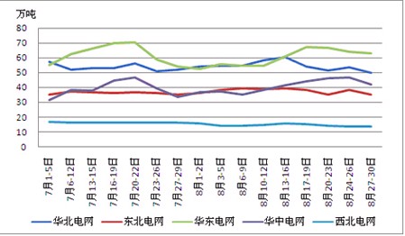 首先,進(jìn)入9月份全國大部分地區(qū)迎峰度夏任務(wù)已經(jīng)完成,華東及東南沿海地區(qū)電煤需求也將出現(xiàn)明顯的季節(jié)性回調(diào)。從下圖各個區(qū)域電網(wǎng)日均耗煤量走勢可以看出,8月中下旬以來,華北電網(wǎng)、東北電網(wǎng)、西北電網(wǎng)以及華東電網(wǎng)日均耗煤量均出現(xiàn)了明顯的下滑趨勢,而華中電網(wǎng)日均耗煤量卻持續(xù)攀升。據(jù)中國天氣網(wǎng)消息,截止到8月27日,今年夏天武漢和長沙的高溫天數(shù)同時達(dá)到36天,并列全國第一,27日當(dāng)天武漢和長沙的最高氣溫分別達(dá)到37.5°和 38.1°。與湖北、湖南的高溫天氣相對應(yīng),8月24日至26日,華中電網(wǎng)日均耗煤量達(dá)到46.3萬噸,與8月初相比增加將近10萬噸。隨著8月底華中地區(qū)紛紛迎來降水,高溫天氣陸續(xù)退去,發(fā)電耗煤量大幅回落。數(shù)據(jù)顯示,8月30日,華中電網(wǎng)耗煤量已經(jīng)下降至32.4萬噸,與26日相比,大幅減少15.3 萬噸,下降32%。進(jìn)入9月份,隨著氣溫進(jìn)一步回落,全國電煤需求仍將進(jìn)一步回落。