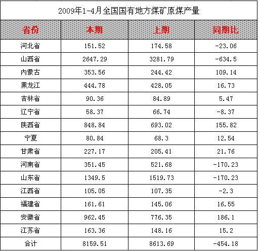 2009年1-4月全國(guó)國(guó)有地方煤礦原煤產(chǎn)量統(tǒng)計(jì)