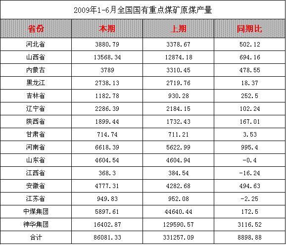 2009年1-6月全國國有重點(diǎn)煤礦原煤產(chǎn)量統(tǒng)計