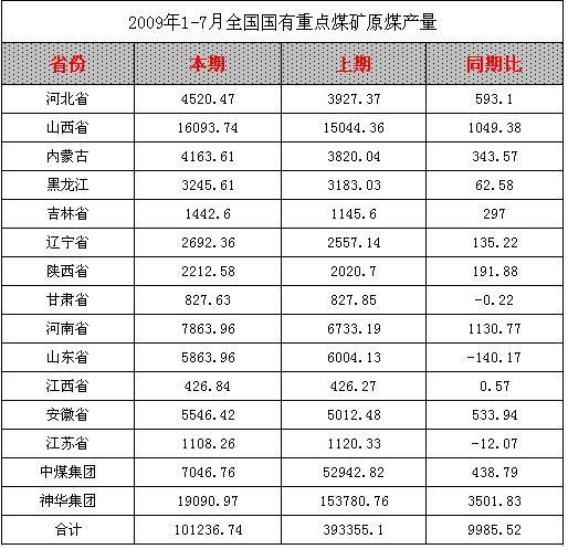 2009年1-7月全國(guó)國(guó)有重點(diǎn)煤礦原煤產(chǎn)量統(tǒng)計(jì)