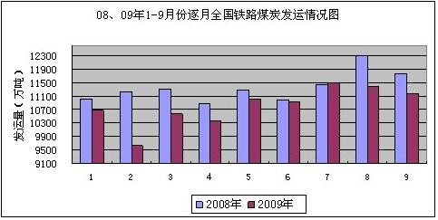 1、鐵路煤炭運量呈現(xiàn)持續(xù)轉(zhuǎn)好局面。統(tǒng)計顯示(參見附圖),今年前9個月除7月份以外,各月全國鐵路煤炭運量均低于去年同期水平,但是整體呈現(xiàn)逐步回升局面;當然,鐵路煤炭運量恢復的基礎或者動力(這里指煤炭消費和供求形勢)似乎略顯不足,導致各月所完成煤炭運量波動較大。