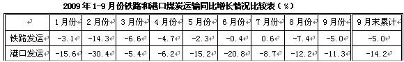 整體上看,今年前三季度鐵路和港口煤炭運輸全部呈現(xiàn)萎縮局面,增長狀況低于宏觀經(jīng)濟發(fā)展水平,季節(jié)性用電用煤高峰、煤炭進口的大幅度增加和煤炭出口的急劇萎縮、山西省重點地區(qū)煤炭資源偏緊等問題對煤炭運輸?shù)挠绊懙玫匠浞煮w現(xiàn)。