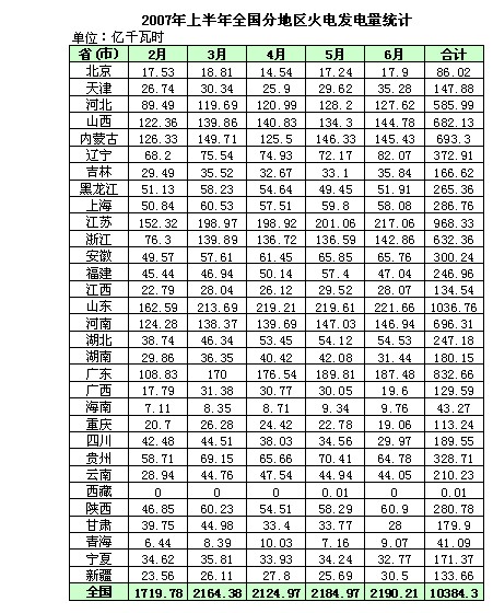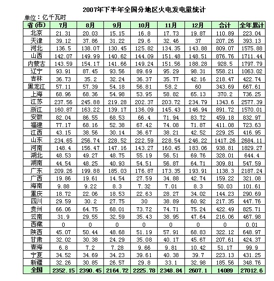 2007年全國(guó)分省市火電發(fā)電量統(tǒng)計(jì)