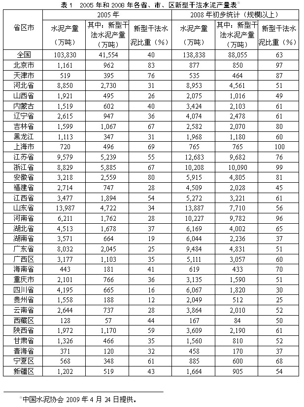 水泥不宜遠(yuǎn)運,與鋼鐵等產(chǎn)品不同,水泥市場是地區(qū)性市場。從表1可看到,2008年我國各省、市、區(qū)水泥總產(chǎn)量和新型干法產(chǎn)量有很大差別。浙江省、河南省等人均水泥產(chǎn)量較高,新型干法產(chǎn)量比例已達(dá)95%以上;山西省、湖南省和四川省等人均水泥產(chǎn)量較低,新型干法產(chǎn)量比例都在50%以下。通過各種信息渠道獲悉,在人均水泥產(chǎn)量和新型干法比例較高的少數(shù)省份已出現(xiàn)新型干法產(chǎn)量過剩問題;在水泥價格高和需求量大的少數(shù)省份出現(xiàn)了盲目建設(shè)新型干法生產(chǎn)線現(xiàn)象,即將產(chǎn)生產(chǎn)能過剩。但是,大部分地區(qū)不存在新型干法產(chǎn)能過剩問題。