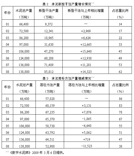 進(jìn)入新世紀(jì)后,水泥工業(yè)結(jié)構(gòu)調(diào)整取得很大進(jìn)步。從表2可看到,新型干法水泥產(chǎn)量占總產(chǎn)量的比例由2001年的14%提高到2008年的62%。從表2和表3的數(shù)據(jù)可以得出,近幾年我國水泥總量的增長和結(jié)構(gòu)調(diào)整,主要依靠新型干法的迅速發(fā)展,而落后方法產(chǎn)能的淘汰量并不大。2001年水泥落后方法產(chǎn)量約5.7億噸,2008年約5.3億噸,8年間只下降了0.4億噸?梢,淘汰落后生產(chǎn)方法的任務(wù)十分艱巨。為在3年內(nèi)徹底淘汰落后方法產(chǎn)能,必須采取正確方針和得力措施。