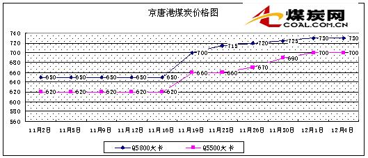 在國內(nèi)動力煤市場整體走勢良好的大形勢下,京唐港煤炭市場活躍,市場供不應(yīng)求,價(jià)格不斷攀升。京唐港目前的煤炭價(jià)格調(diào)整情況是:5800大卡、5500大卡動力煤上調(diào)10元至715-730元/噸、690-700元/噸,5000大卡、4500大卡上調(diào)20元至600-620元/噸、520-540元/噸。詳情見下圖: