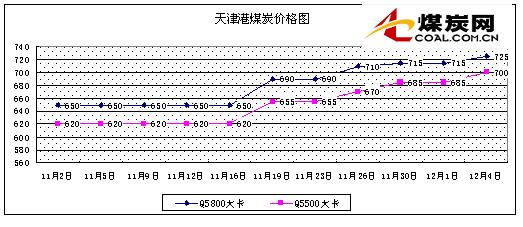 天津港:最近煤炭市場活躍,煤炭供不應(yīng)求,煤炭價格不斷攀升,本周天津港動力煤價格上調(diào)10-15元/噸。其中5800大卡/千克的動力煤上調(diào)10元至710-725元/噸,5500大卡/千克的動力煤上調(diào)15元至685-700元/噸,5000大卡/千克的原煤上調(diào)15元至595-610元/噸,5500大卡塊煤上調(diào)10元至780-800元/噸。一方面是冬季煤炭需求上升,增加了對動力煤的需求量,另一方面則是近期華北、華東地區(qū)電廠存煤緊張,加緊煤炭儲備,進(jìn)一步增加了對動力煤價格的支撐。詳情見下圖: