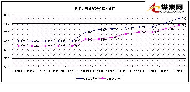 國內(nèi)動(dòng)力煤市場(chǎng)整體走勢(shì)穩(wěn)定,部分地區(qū)價(jià)格繼續(xù)保持上漲態(tài)勢(shì)。一方面是當(dāng)前國內(nèi)煤炭供應(yīng)并不充足,年底各主流企業(yè)主要以供應(yīng)重點(diǎn)合同以及保電煤為主,市場(chǎng)供應(yīng)緊張;另一方面則是年底各企業(yè)為保證安全生產(chǎn),產(chǎn)量基本不會(huì)繼續(xù)增長(zhǎng);另外,近期電廠庫存緊張,持續(xù)補(bǔ)充庫存嗎,以及供暖用煤持續(xù)快速增長(zhǎng),也導(dǎo)致煤炭?jī)r(jià)格繼續(xù)上漲;最后,臨近年底訂貨會(huì),煤企定調(diào)上調(diào)價(jià)格,也將進(jìn)一步增強(qiáng)其定價(jià)權(quán)。在國內(nèi)煤炭市場(chǎng)整體走勢(shì)良好的大形勢(shì)下,京唐港煤價(jià)不斷攀升。京唐港目前的煤炭?jī)r(jià)格情況是:5800大卡的大同優(yōu)混、5500大卡的山西優(yōu)混分別上調(diào)15元/噸至770-780元/噸、735-740元/噸;5000大卡的山西大混上調(diào)10元至630-650元/噸。詳情請(qǐng)見下圖: