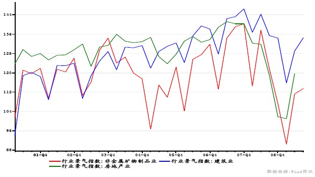 從圖1可見:2008年下半年起,非金屬建材行業(yè)的景氣指數出現(xiàn)回落,09年第一季度到達低點,二季度后開始反彈,目前仍處于上升通道中。預計2010年建材行業(yè)的景氣程度有望維持在相對高的水平。
