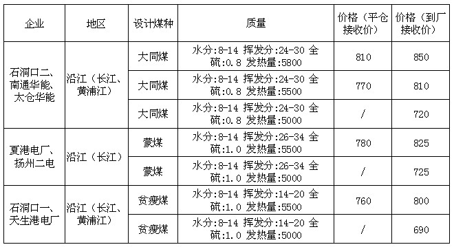 1月5日華東地區(qū)沿江電廠煤炭接收價格