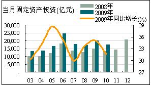 ——城鎮(zhèn)固定資產(chǎn)投資在10月份有所下降,單月同比增長(zhǎng)31.65%,較9月份下降3.5個(gè)百分點(diǎn),1~10月累計(jì)城鎮(zhèn)固定資產(chǎn)投資同比增長(zhǎng)33.10%;