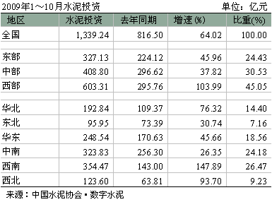 1~10月份,全國(guó)水泥累計(jì)投資額為1,339.24億元,同比增長(zhǎng)64.02%,較1~9月份同比增速有小幅提升。