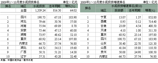 從各省市狀況來看,受災(zāi)后重建的影響,四川地區(qū)水泥投資依然居于全國(guó)首位,投資額為190.73億元,同比增長(zhǎng)183.90%,增速排名第6位;投資總額和增速位居前10的省市主要位于中西部地區(qū),證實(shí)了政府西部開發(fā)的傾向和經(jīng)濟(jì)發(fā)展重心的偏移對(duì)水泥行業(yè)發(fā)展所產(chǎn)生的影響。