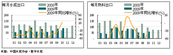 ——10月份水泥出口在9月份同比增長(zhǎng)的基礎(chǔ)上繼續(xù)大幅提升,首次實(shí)現(xiàn)了今年以來的同比正增長(zhǎng);熟料出口盡管仍未擺脫負(fù)增長(zhǎng),但較上個(gè)月的同比下降幅度已有很大程度的恢復(fù)。