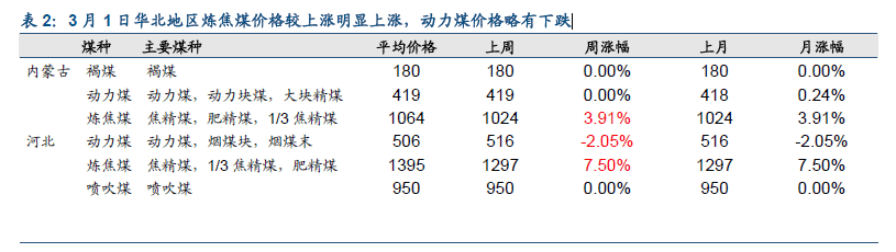 3 月1 日華北地區(qū)煉焦煤價(jià)格較上漲明顯上漲,動(dòng)力煤價(jià)格略有下跌