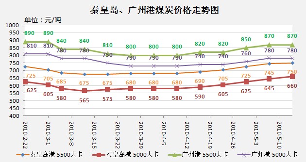 近期,資源整體偏緊的形勢(shì)依舊,需求預(yù)期繼續(xù)保持旺盛增長(zhǎng),經(jīng)濟(jì)回暖跡象明顯等多方因素推動(dòng)價(jià)格繼續(xù)上漲。截至2010年5月14日,秦皇島港5800大卡、5500大卡、5000大卡的煤炭平均指導(dǎo)價(jià)格為790元/噸、750元/噸和660元/噸,分別較上周上漲10元、5元和15元每噸。