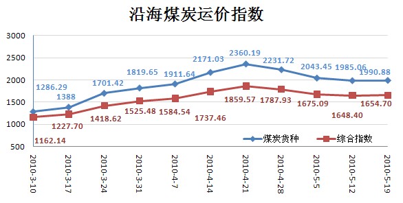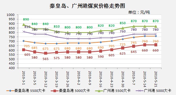 本周,煤炭市場(chǎng)需求增長(zhǎng)速度有所減緩,主要是受宏觀經(jīng)濟(jì)政策的影響,目前市場(chǎng)主要呈現(xiàn)出觀望態(tài)度。截至2010年5月21秦皇島港5800大卡、5500大卡、5000大卡的煤炭平均指導(dǎo)價(jià)格為790元/噸、760元/噸和660元/噸,與上周基本持平。