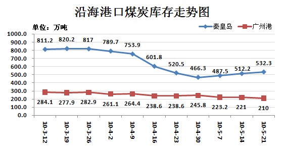 本周,秦皇島港煤炭調(diào)入量繼續(xù)增加,吞吐量小幅回落,港口庫(kù)存繼續(xù)回升。截至2010年5月21日,秦皇島當(dāng)日合計(jì)鐵路調(diào)入量為62.4萬噸,當(dāng)日合計(jì)港口吞吐量為43.5萬噸,月日均調(diào)入量為68萬噸,月日均吞吐量為65萬噸。秦皇島港口煤炭庫(kù)存為532.3萬噸,較上周同期上漲3.92%。