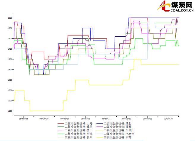 山西呂梁二級(jí)冶金焦1850元/噸,準(zhǔn)一級(jí)冶金焦1950元/噸,均為出廠含稅價(jià);臨汾一級(jí)冶金焦現(xiàn)車板含稅價(jià)1980元/噸,準(zhǔn)一級(jí)冶金焦車板含稅價(jià)1950元/噸,二級(jí)冶金焦出廠含稅價(jià)1780元/噸;長治二級(jí)冶金焦出廠含稅價(jià)1750元/噸,一級(jí)冶金焦?jié)q車板含稅價(jià)1900元/噸;介休二級(jí)冶金焦出廠含稅價(jià) 1800元/噸,一級(jí)冶金焦出廠含稅價(jià)1900元/噸。河南濟(jì)源地區(qū)二級(jí)冶金焦車板含稅價(jià)1900元/噸;安陽地區(qū)二級(jí)冶金焦出廠含稅價(jià)1900元/噸;平頂山地區(qū)大型主導(dǎo)焦化企業(yè)二級(jí)冶金焦出廠含稅價(jià)1850-1900元/噸左右。河北地區(qū)邢臺(tái)二級(jí)冶金焦到廠含稅價(jià)1950元/噸;邯鄲準(zhǔn)一級(jí)到廠價(jià)1980-2000元/噸,二級(jí)冶金焦含稅出廠價(jià)在1900-1920元/噸;唐山二級(jí)冶金焦到廠價(jià)1930/噸。安徽淮南、淮北地區(qū)二級(jí)冶金焦含稅價(jià)格1900-1950元/噸。四川攀枝花地區(qū)二級(jí)冶金焦主流價(jià)格在1750元/噸。貴州六盤水地區(qū)二級(jí)冶金焦出廠價(jià)格1800元/噸。山東淄博二級(jí)冶金焦出廠含稅價(jià)1900元/噸;東阿地區(qū)國標(biāo)一級(jí)冶金焦出廠含稅價(jià)2100-2200。上海二級(jí)冶金焦含稅價(jià)格2020元/噸。