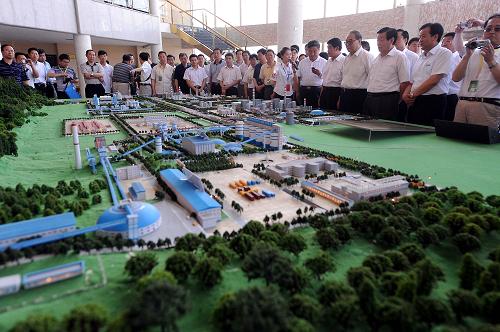 7月8日,在同煤集團(tuán)塔山循環(huán)經(jīng)濟(jì)園區(qū)內(nèi),與會(huì)代表正在參觀園區(qū)沙盤模型。當(dāng)日,煤炭工業(yè)節(jié)能減排暨循環(huán)經(jīng)濟(jì)現(xiàn)場會(huì)議在山西大同召開,與會(huì)代表們參觀同煤集團(tuán)塔山循環(huán)經(jīng)濟(jì)園區(qū),就園區(qū)內(nèi)煤礦、高嶺土廠、矸石磚廠、電廠等煤礦資源循環(huán)利用項(xiàng)目進(jìn)行了經(jīng)驗(yàn)交流。