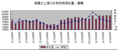 雖然當(dāng)前全球經(jīng)濟(jì)有些不確定因素,但仍在緩慢復(fù)蘇之中,國家宏觀經(jīng)濟(jì)也在高位運(yùn)行,受益于國內(nèi)外貿(mào)易持續(xù)增長,二季度來港口貨物吞吐量屢創(chuàng)歷史新高,上半年全國規(guī)模以上港口貨物吞吐量增速達(dá)到14.8%,港口運(yùn)輸生產(chǎn)繼續(xù)保持高位態(tài)勢,但增速有所下滑。受去年基數(shù)較低、季節(jié)性因素以及國內(nèi)對大宗貨物需求旺季等利好,年初港口運(yùn)輸生產(chǎn)紅紅火火,首季港口貨物吞吐量增速達(dá)到23.2%,其中1月份更是達(dá)到35.8%的歷史高位。但隨后在外貿(mào)鐵礦石、煤炭領(lǐng)跌下,增速逐月遞減,4、5、6月份增速分別為15.9%、15.3%和14.9%,呈現(xiàn)平穩(wěn)下滑態(tài)勢,顯示由于去年基數(shù)較低而產(chǎn)生的高增長已告終結(jié),取代之的是增速趨向平穩(wěn)。