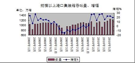 與鐵礦石由熱趨冷相反,隨著全球經(jīng)濟(jì)回暖,港口集裝箱駛?cè)肟燔嚨,成為上半年港口運(yùn)輸生產(chǎn)最亮點(diǎn)。去年金融危機(jī)發(fā)源地歐美日經(jīng)濟(jì)陷入二戰(zhàn)以來最嚴(yán)重的衰退,需求萎縮,集裝箱運(yùn)輸成為港口重災(zāi)區(qū),全年出現(xiàn)較大負(fù)增長,但隨著世界經(jīng)濟(jì)逐步復(fù)蘇,發(fā)達(dá)國家經(jīng)濟(jì)需求恢復(fù)性上升,特別是東南亞、中東等發(fā)展中國家經(jīng)濟(jì)恢復(fù)較快,貿(mào)易量急速上升,成為集裝箱運(yùn)輸新的增長極。規(guī)模以上港口集裝箱年初就超出金融危機(jī)前水平,上半年增速達(dá)到22.3%,成為上半年增長最快的貨種之一,并創(chuàng)出歷史最好水平,形勢好于預(yù)期。但流向歐美等發(fā)達(dá)國家集裝箱吞吐量仍不盡人意,其增幅少于整體的平均增幅。去年下降幅度較大的一些南方大港,今年上半年得到了補(bǔ)漲,均有良好業(yè)績表現(xiàn)。全球排名第二大港-上海港,5月份集裝箱吞吐量創(chuàng)出歷史新高;深圳港、寧波港上半年增速均提升到三成以上,保持高速增長,成為集裝箱增長的中堅力量。而去年增長相對較快的北方港口,由于基數(shù)較高,表現(xiàn)相對平常,增幅低于全國平均值。