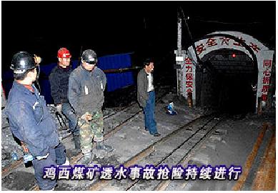 記者:我現在就在發(fā)生透水事故的恒鑫源煤礦,前面不遠處就是煤礦的井口,經過一夜的救援工作,井口現在依然很忙碌,雞西市的副秘書長方東初我剛剛見到了他,他向我介紹說目前井下的水依然在上漲,水位已經上漲到了140米。這一夜救援工作一直沒有停,包括雞西市委的市委書記王兆力書記,很多領導也都在現場,一夜沒有合眼。據我們了解目前進展是這樣的,分了三個方向向下采取一些措施排水,目前副井安裝的水泵由于瓦斯超限一直沒有辦法啟動,而且有一臺水泵已經燒毀了,目前新的水泵已經安裝了。鉆機向下打孔到今天早上5點累計鉆孔90米,主井安裝的兩臺80立方米的大水泵有一臺目前正常向外排水,另一臺燒毀了,兩臺新的水泵指揮部已經調到現場,目前正在安裝,據我們了解目前搶險救援工作依然十分困難,井下被困24名礦工的消息目前也沒有。
