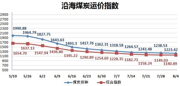 本周,沿海運(yùn)輸市場繼續(xù)微幅下跌,海運(yùn)價(jià)格逐漸啟穩(wěn)。截至8月4日,沿海散貨運(yùn)價(jià)指數(shù)報(bào)收于1140.89點(diǎn),較上周下跌0.7%;沿海煤炭貨種運(yùn)價(jià)指數(shù)報(bào)收于1223.42點(diǎn),較上周下跌1.2%。其中,秦皇島-廣州、上海、寧波、福州運(yùn)價(jià)指數(shù)分別報(bào)收于1393.35點(diǎn)、1366.99點(diǎn) 1061.46和932.43點(diǎn),秦皇島-廣州和寧波運(yùn)價(jià)指數(shù)分別都較上周下跌1.9%,另外兩條航線指數(shù)與上周持平。目前,以上四條航線的運(yùn)價(jià)分別為 51元/噸、30元/噸、30元/噸和40元/噸,其中秦皇島—廣州和寧波的運(yùn)價(jià)每噸下跌了1元,其他兩條航線價(jià)格與上周持平。
