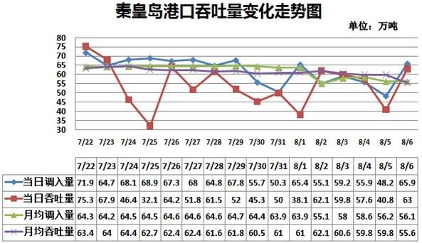 本周,秦皇島受到天氣影響,連續(xù)出現(xiàn)封航情況,影響了正常發(fā)運(yùn),使得秦皇島的煤炭調(diào)入量和發(fā)運(yùn)量出現(xiàn)小幅回落。截至到8月6日,秦皇島煤炭月日均調(diào)入量為 56.1萬噸,環(huán)比上周下跌了13%;月日均吞吐量為55.6萬噸,環(huán)比上周下跌了8%;秦皇島港口煤炭庫存為732萬噸,較上周同期上漲了4.8%。