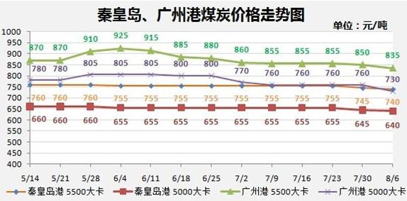 本周,秦皇島煤炭價(jià)格繼續(xù)小幅下滑。截至2010年8月6日,秦皇島港5800大卡、5500大卡、5000大卡的煤炭平均指導(dǎo)價(jià)格為785元/噸、740元/噸和640元/噸,其中5500和5000大卡煤炭較上周每噸下跌5元/噸。