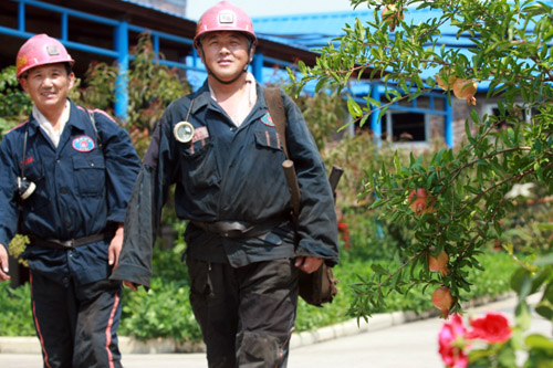 2010年8月10日,安徽淮北礦業(yè)岱河煤礦的生產(chǎn)車間旁,礦工們正高興的察看石榴長勢。近年來,該礦以科學高效的土地復墾來重建和改善生態(tài)環(huán)境,并通過工業(yè)廣場的邊角地、巴掌田開展喬灌花木、石榴、柿子等名優(yōu)林果種植,目前礦區(qū)總綠化面積達40多萬平方米,占可綠化面積的98%以上,呈現(xiàn)出“春有花、夏有草、秋有果、冬有青”的怡人景色。
