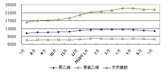 主要化工產(chǎn)品價(jià)格小幅下降。7月份大中城市化工產(chǎn)品價(jià)格小幅下降。其中,高壓聚乙烯、聚氯乙烯、天然橡膠平均價(jià)格為每噸11687元、7483元、22588元,與上月相比分別下降2.29%、1.857%、0.35%。
