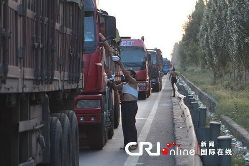 2010年8月16日,京藏高速內(nèi)蒙古興和到河北段進(jìn)京方向,小販向司機(jī)出售盒飯。(圖片來(lái)源:國(guó)際在線)