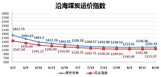 本周,沿海煤炭運輸市場止跌起穩(wěn)回升,部分煤炭運輸航線指數(shù)小幅回升。截至8月18日,沿海散貨運價指數(shù)報收于1151.07點,較上周回升0.9%;沿海煤炭貨種運價指數(shù)報收于1242.43點,較上周回升1%。其中,秦皇島-廣州、上海、寧波、福州運價指數(shù)分別報1349.49點、1400.69點、 1085.22和924.19點,除秦皇島-廣州航線指數(shù)下跌1.6%外,其他航線指數(shù)運價指數(shù)分別較上周回升1.3%、3.6%和1.2%;目前以上四條航線的運價分別為48元/噸、31元/噸、31元/噸和39元/噸,其中秦皇島-廣州的運價每噸下跌了2元;秦皇島-上海、寧波的運價每噸回升了1元;秦皇島-福州航線運價基本與上周持平。