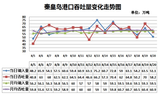 近期秦皇島港經(jīng)常受到大雨和大風(fēng)等天氣影響,港口發(fā)運用跌宕起伏,但整體水平依舊保持平穩(wěn)。截至到8月20日,秦皇島煤炭月日均調(diào)入量為59.5萬噸,月日均吞吐量為60.9萬噸;秦皇島港口煤炭庫存為721.7萬噸,較上周同期下降0.48%。