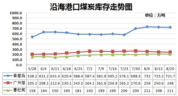 受到秦皇島港庫存較高影響,部分大秦線煤炭資源分配到周邊港口,截至8月20日曹妃甸港煤炭庫存為211萬噸,之前曹妃甸港的煤炭庫存一直呈持續(xù)上升態(tài)勢,近期逐漸進(jìn)入整理階段。
