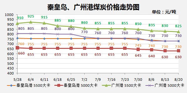 本周,秦皇島港煤炭價格止跌起穩(wěn)。截至2010年8月20日,秦皇島港5800大卡、5500大卡、5000大卡的煤炭平均指導(dǎo)價格為775元/噸、730元/噸和630元/噸,與上周持平。
