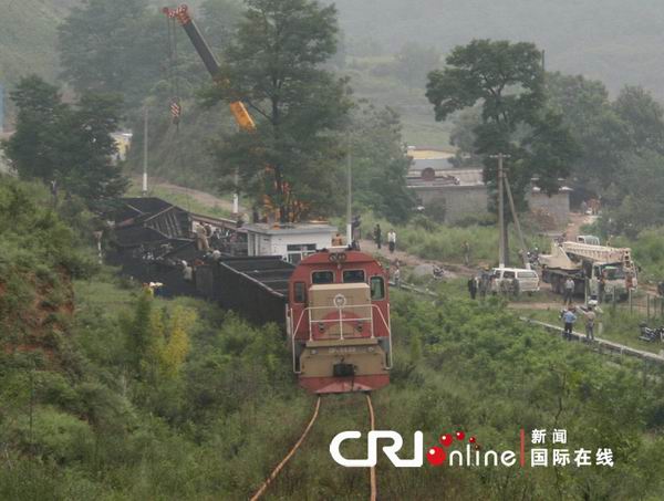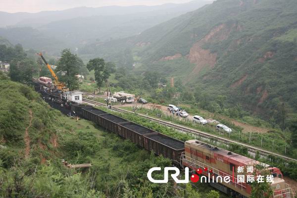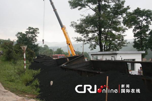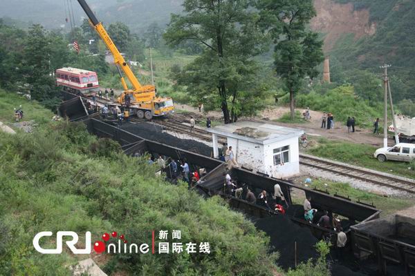 2010年8月24日,陜西銅川,脫軌運(yùn)煤列車已上至車站避險(xiǎn)安全線小半坡,大吊車緊急處理事故。