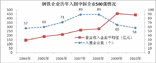 從2004年開始到2010年,入圍中國(guó)企業(yè)500強(qiáng)的鋼鐵企業(yè),分別為57、60、71、89、89、65、58家,雖然中國(guó)企業(yè)500強(qiáng)入圍底線從2004年的30.6億元增加到2009年的110.8億元,鋼鐵企業(yè)入圍中國(guó)企業(yè)500強(qiáng)的企業(yè)營(yíng)業(yè)收入平均值從145億元增加到440.38億元,6年增加了295億元,入圍企業(yè)個(gè)數(shù)最高達(dá)到了89家企業(yè),由于2010年入圍門檻提高幅度很大,企業(yè)個(gè)數(shù)比上年減少了7家,營(yíng)業(yè)收入平均值下降了15億元。尤其受前年國(guó)際金融危機(jī)等客觀因素影響下,世界各國(guó)鋼鐵企業(yè)營(yíng)業(yè)收入紛紛下滑,而我國(guó)鋼鐵企業(yè)不僅沒有下滑反而提高,這充分展現(xiàn)了我國(guó)鋼鐵企業(yè)的實(shí)力和潛力,我國(guó)鋼鐵企業(yè)有希望有能力做大做強(qiáng)。