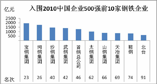入圍中國(guó)企業(yè)500強(qiáng)的鋼鐵企業(yè)前10家企業(yè)(集團(tuán)):寶鋼集團(tuán)、河北鋼鐵集團(tuán)、沙鋼集團(tuán)、武鋼集團(tuán)、首鋼總公司、太鋼集團(tuán)、山東鋼鐵集團(tuán)、天津冶金集團(tuán)、鞍鋼、北臺(tái)見圖)。