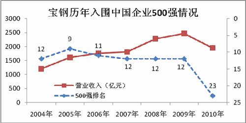 在歷年鋼鐵企業(yè)入圍中國(guó)企業(yè)500強(qiáng)中,寶鋼集團(tuán)在鋼鐵企業(yè)中始終排名第一,自2004年開展中國(guó)企業(yè)500強(qiáng)的第二年開始,排名有所下降,但營(yíng)業(yè)收入從2004年到2008年一直上升,由于國(guó)際環(huán)境影響,2009年?duì)I業(yè)收入有所下降,環(huán)比提高9.9%,營(yíng)業(yè)收入三年平均增長(zhǎng)率為2.4%。寶鋼集團(tuán)不僅在中國(guó)名列前茅,在世界已連續(xù)7年入圍世界500強(qiáng)。