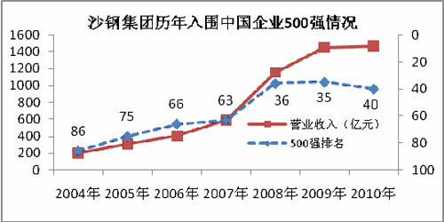 沙鋼集團(tuán)在2010中國(guó)企業(yè)500強(qiáng)中排名第40位,在鋼鐵企業(yè)中,營(yíng)業(yè)收入環(huán)比提高42%。沙鋼集團(tuán)連續(xù)兩年入圍世界企業(yè)500強(qiáng)。