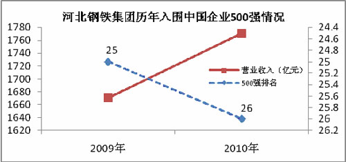 河北鋼鐵集團(tuán)于2008年6月成立,2009年入圍中國(guó)企業(yè)500強(qiáng)排名25位,2010年排名26位,營(yíng)業(yè)收入?yún)s上升了6%。河北鋼鐵集團(tuán)連續(xù)兩年進(jìn)入世界500強(qiáng)企業(yè)行列。